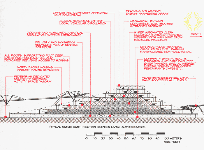 This is a typical north/south section between two adjacent living amphihtheaters.
